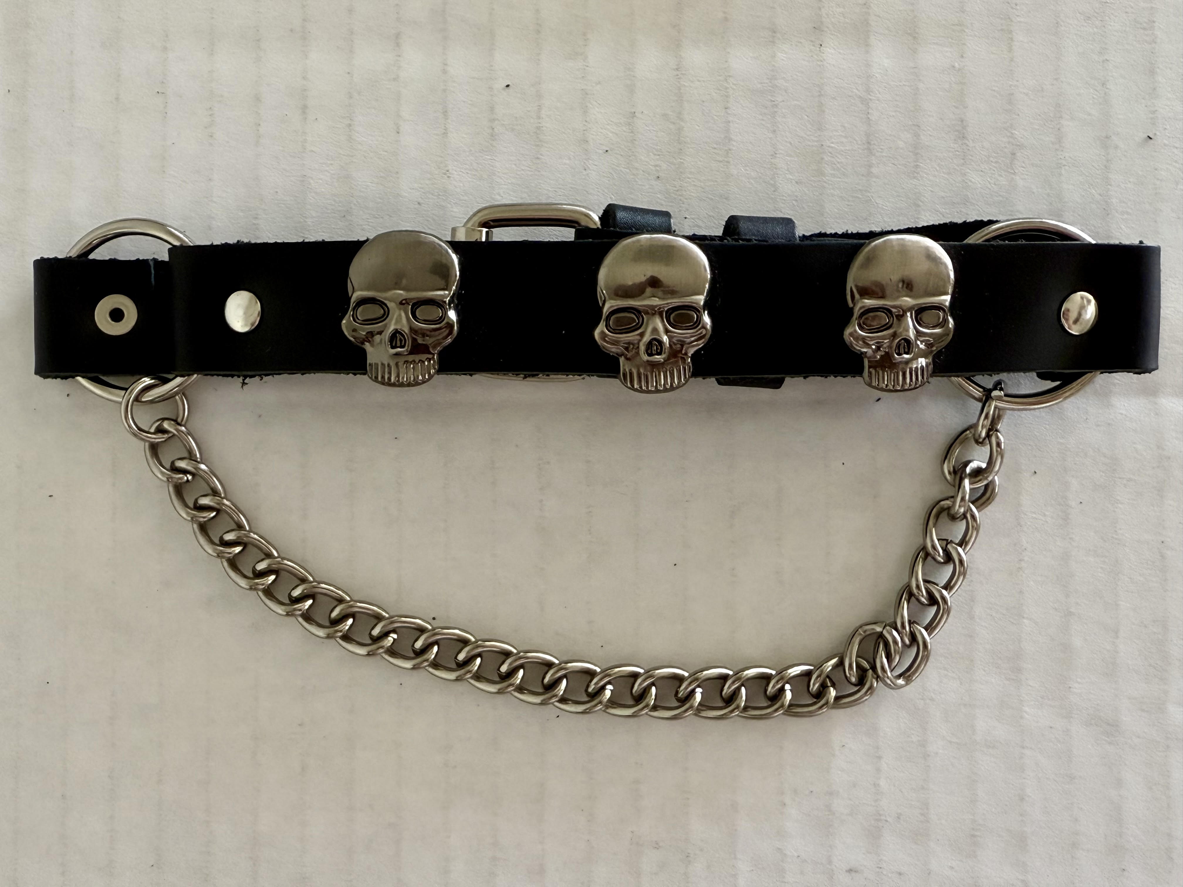 Boot chains have become a great accessory when you're looking to add to your style, and Dream Apparel's always down to help. Our boot chain features three beautiful skulls. Crafted absolutely stunningly, it is not only an eye-catcher but comfortable as well. The leather like PVC belt is sturdy and durable while the chrome chain makes it an easy fit for just about anyone. Putting comfortability and style as the top priorities, this chain is no doubt a must have especially for the bike community.