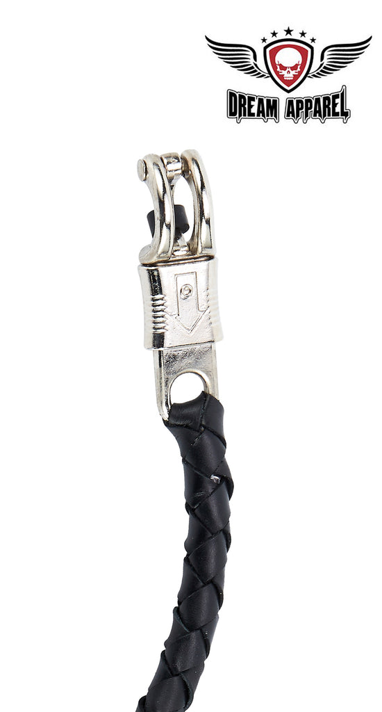 Our get back whips are back but it just got a bit thicker! Now, at 1" thick and 42" long, this beautiful hand-braided black get back whip with Ball-8 gives off an authentic vintage look and feel that you've been longing for. It comes with a stainless steel quick-release clip woven to it. Tightly wrapped at the end, with black threaded fringe our decorative get back whips are a great accessory and a fun way to make yourself more visible on the road.