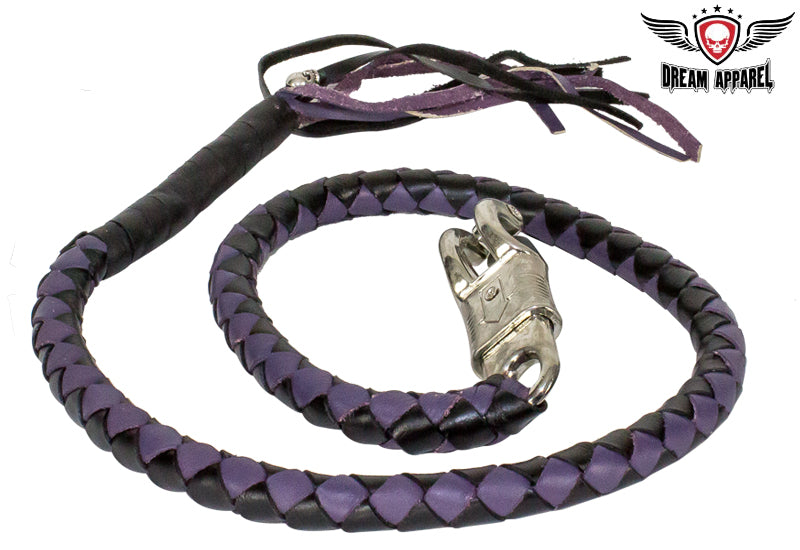 With Dream Apparel's get back whips, you can give your motorcycle a terrific classic look without having to spend a lot of money. Our whips are hand-made using 42" of genuine black and purple naked cowhide leather attached to a stainless steel quick-release clip. Skillfully wrapped at the ends with black leather, purple and black threaded fringe, and a fine silver skull tied to the fringes. Other inferior whips use cheap leather, making them too stiff to be used as proper whips. They do not hang straight down or move freely while riding. So don't settle, order our genuine leather whips today.