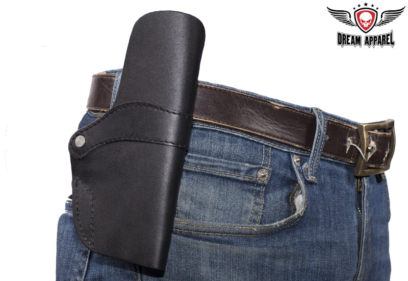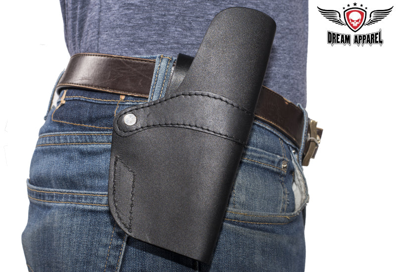 Our black leather gun holster with two leather straps easily and securely attached to the riders belt.The smooth leather finish allows for the generic shape which allows to fit most small and mid size hand guns.