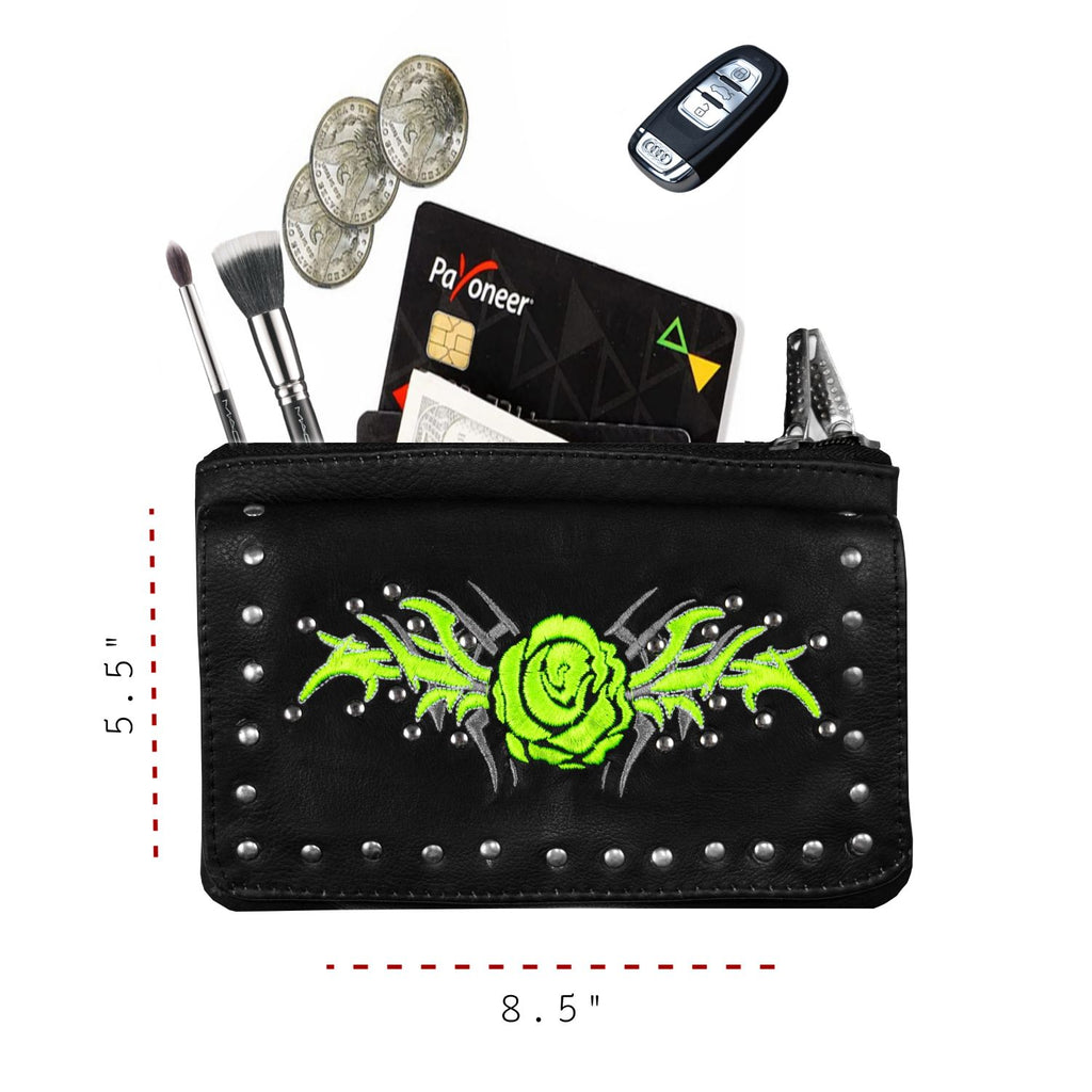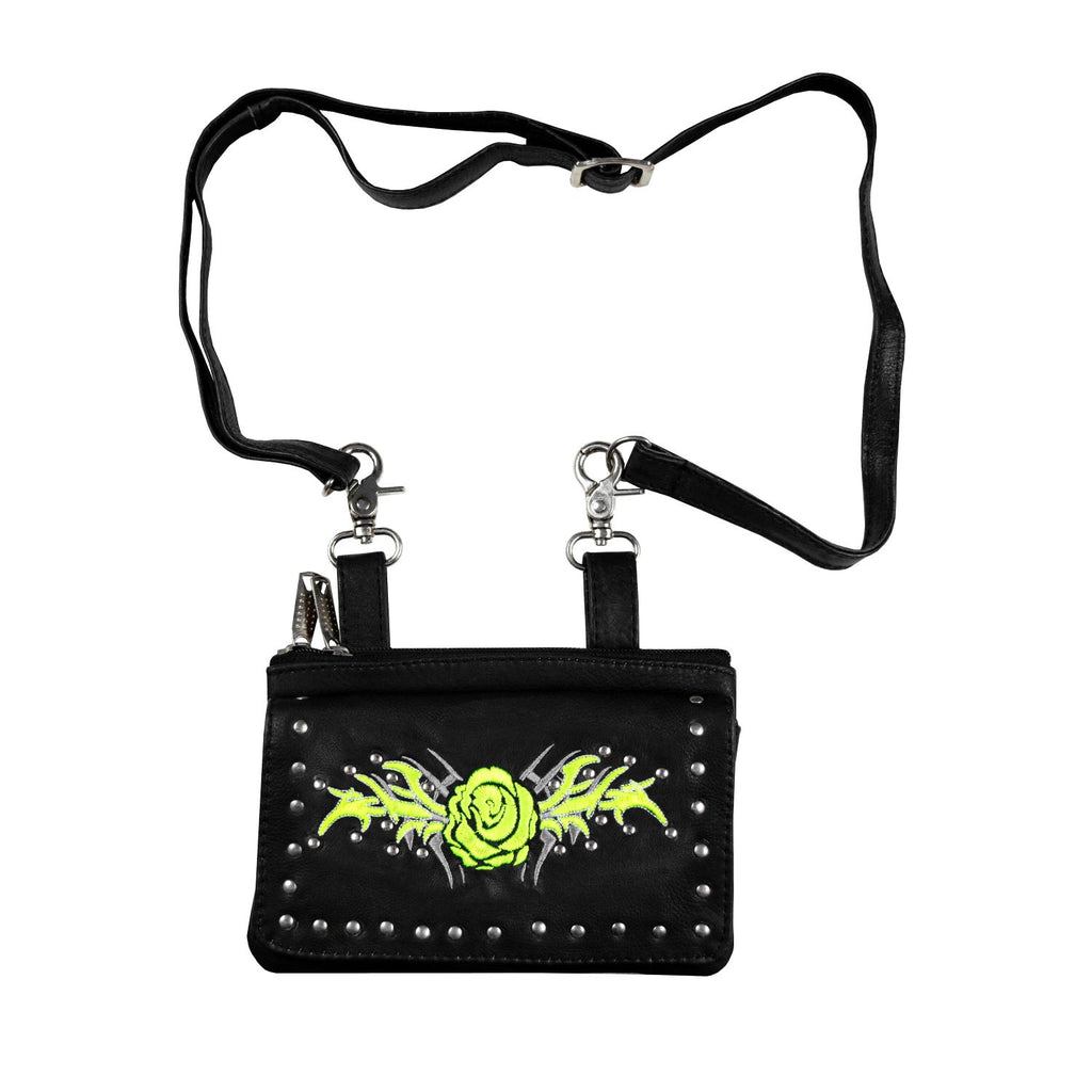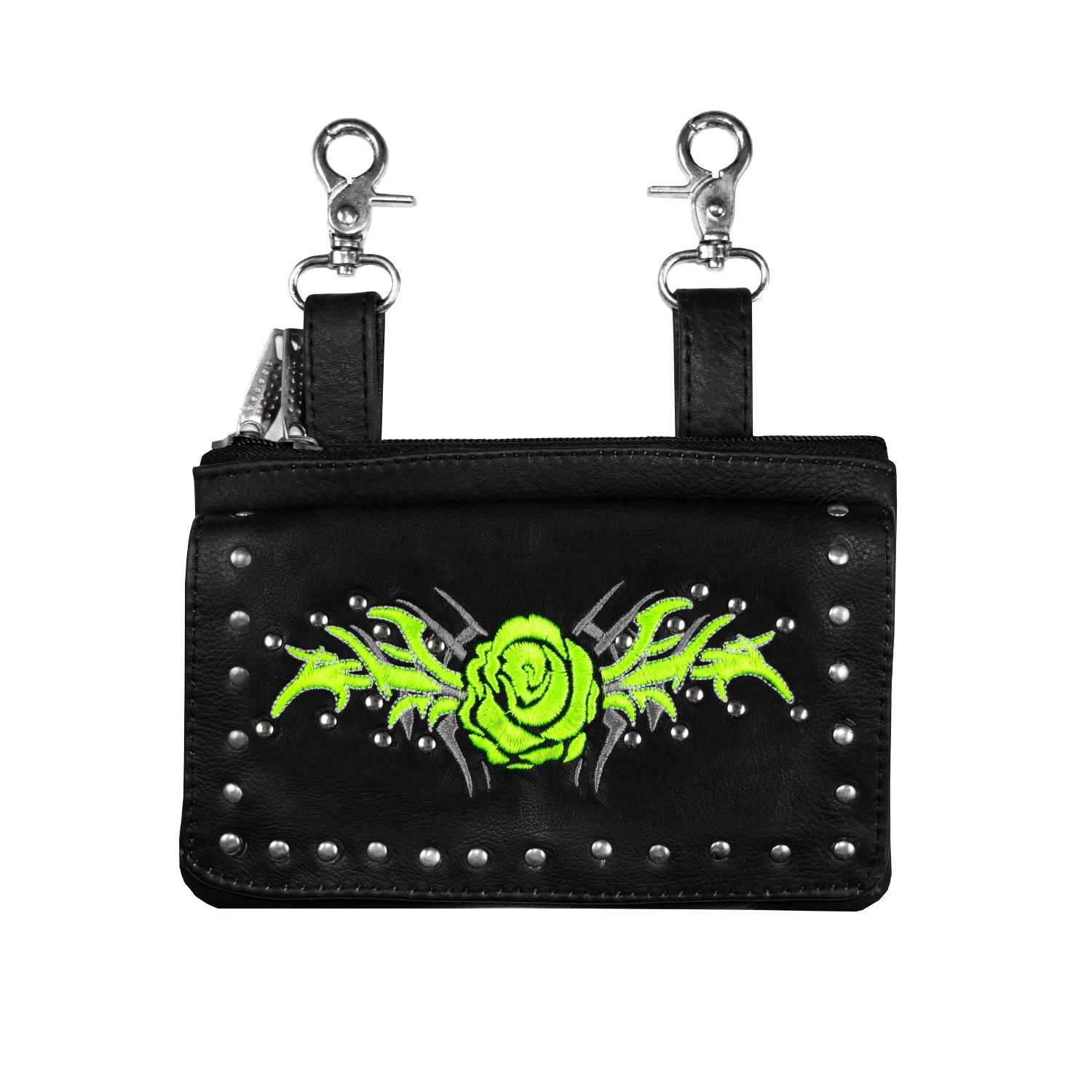 Dream Apparel's 8.5" x 5.5" Studded Naked Cowhide Leather Belt Bag with Lime Green Wings is the perfect belt bag for a long bike run or a night on the town. It features a grey flying rose with hot lime green wings and chrome studs on the front flap. The dual magnetic flap makes a great compartment to carry any large cell phone easily while the two zippered, fabric lined compartments let you carry everything else. It can be clipped to your belt loops by the two sturdy lobster clasps or worn over your shoulder with the leather strap that comes included. This delightful belt bag is the perfect complement to your riding gear so place your order today.