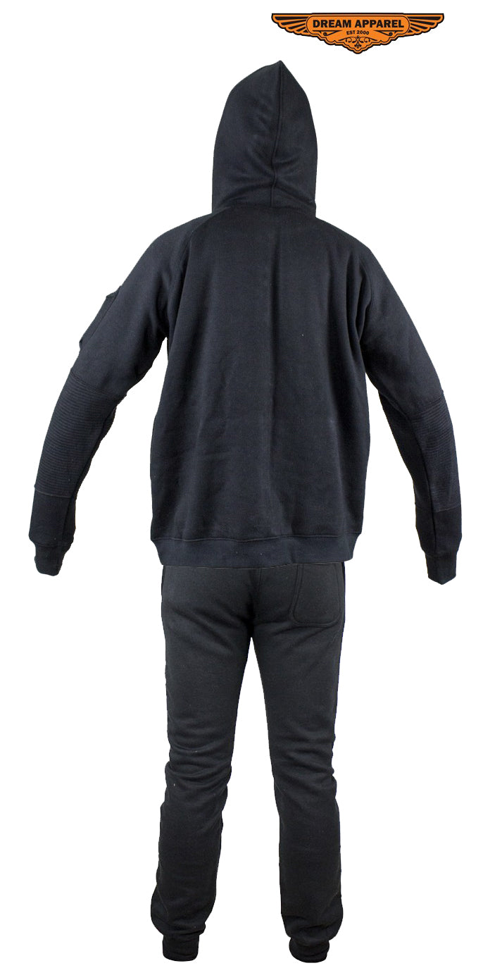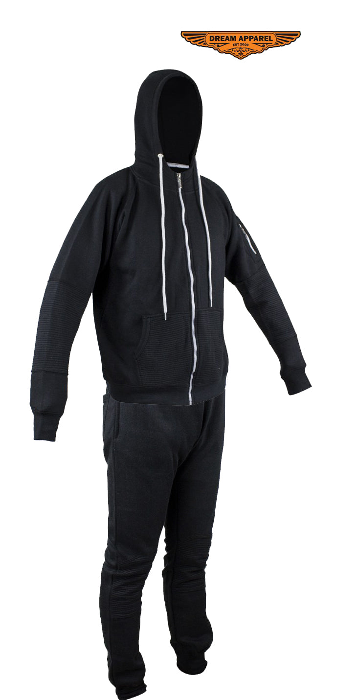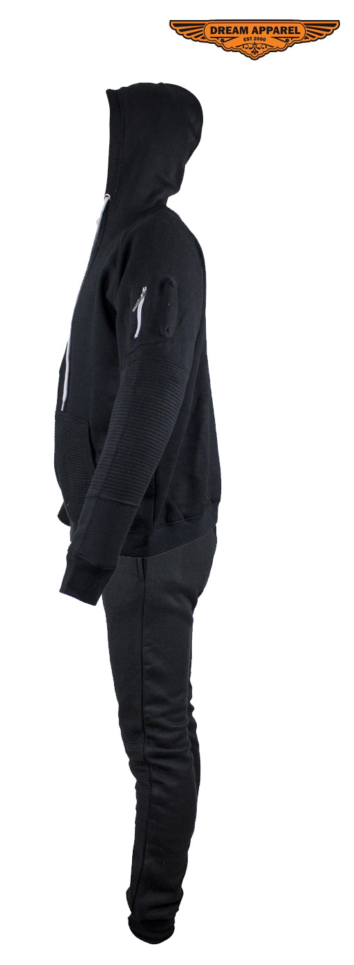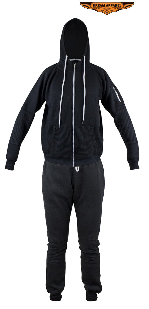 Whether it's a gift for the holiday's or you're just looking to spoil yourself, this black sweatsuit with a beautiful ribbed panel design is the perfect way to go. Drawstrings on both the hoodie and sweats help you adjust to our most comfortable fit, while the elastic bands help make sure it's nice and snug. The gray accents on both complement the entire outfit and make the black standout even more. This is not only a comfortable fit but one that is very much worth it. This is the perfect blend of style and comfort so bikers, if you are ready to get cozy while still turning heads, this ones for you!