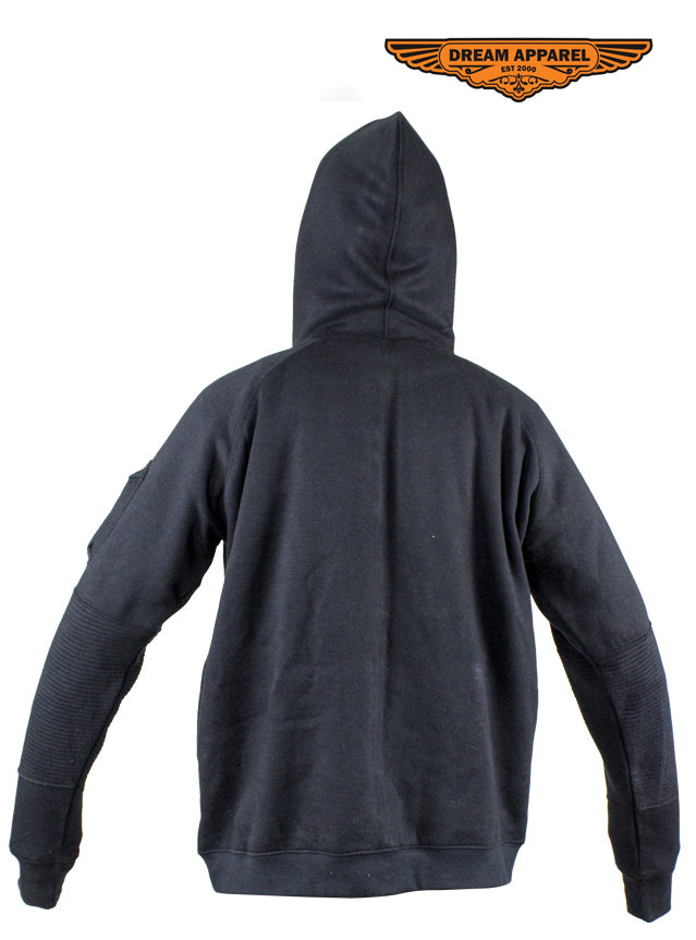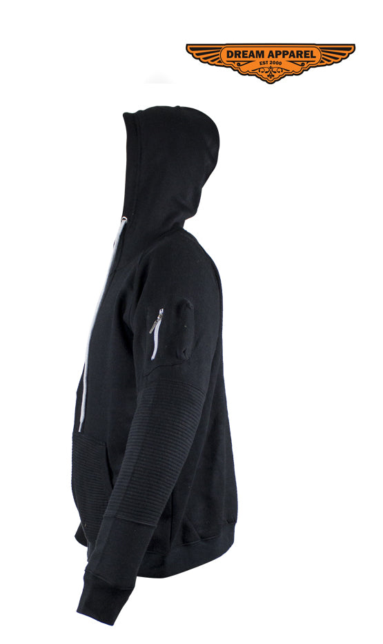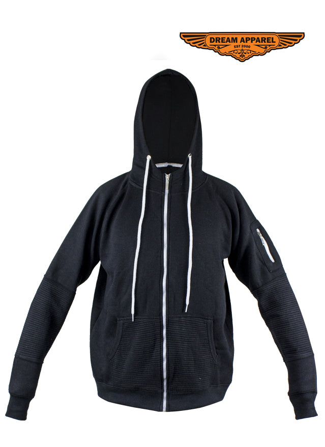 Dream Apparel has found the perfect blend of style and comfort as our new zippered black hoodie with a beautiful ribbed panel design is now out. The gray accents on the zipper and drawstrings complement the black perfectly. The drawstrings have a stylish