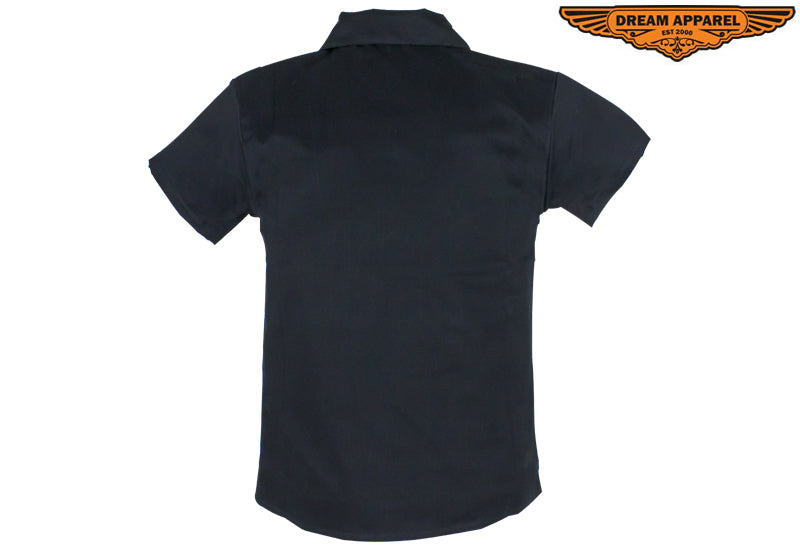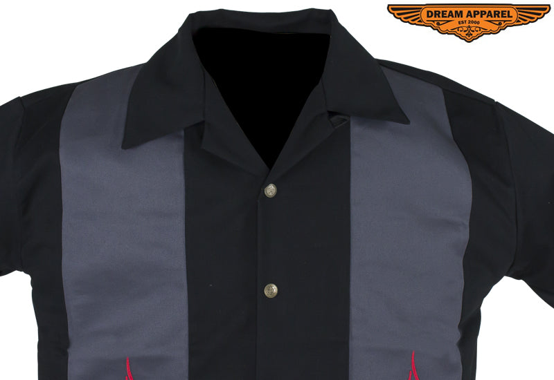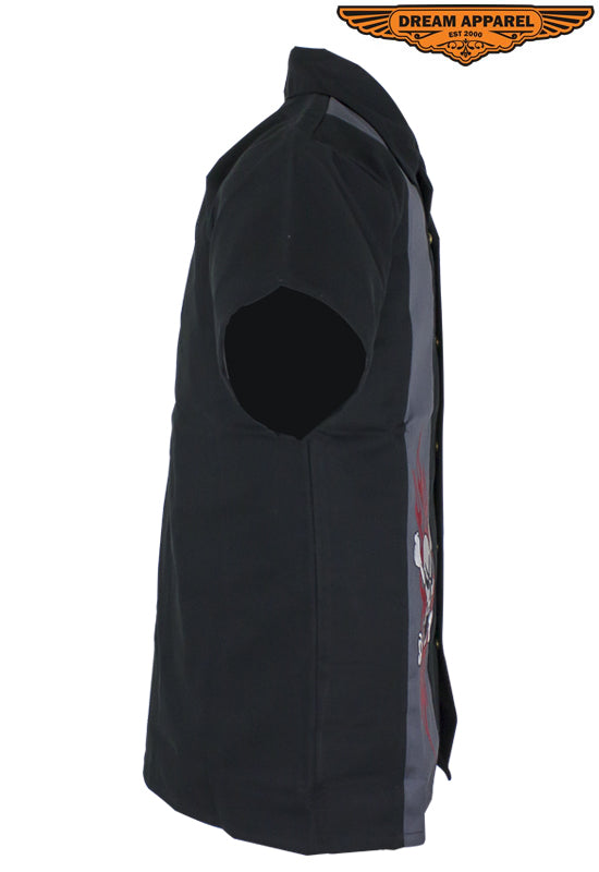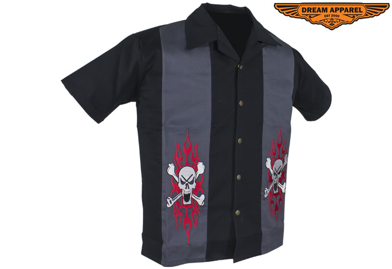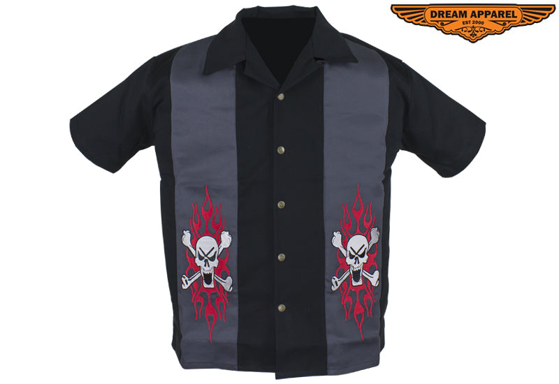 Make a bold statement in this terrific 100% black cotton shirt from Dream Apparel featuring two skull and crossbones in flames in two contrasting gray strips down the front. Great for warmer weather, the short sleeves and soft cotton will have you feeling cool and relaxed. Five stylish buttons with the great seal of Oklahoma stamped on them button up the front. The classic fold down collar and buttoned loop at the neckline finish off the look of this bold and colorful shirt. Be sure to place your order fast as these fashionable shirts sell quickly.
