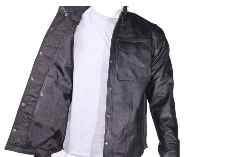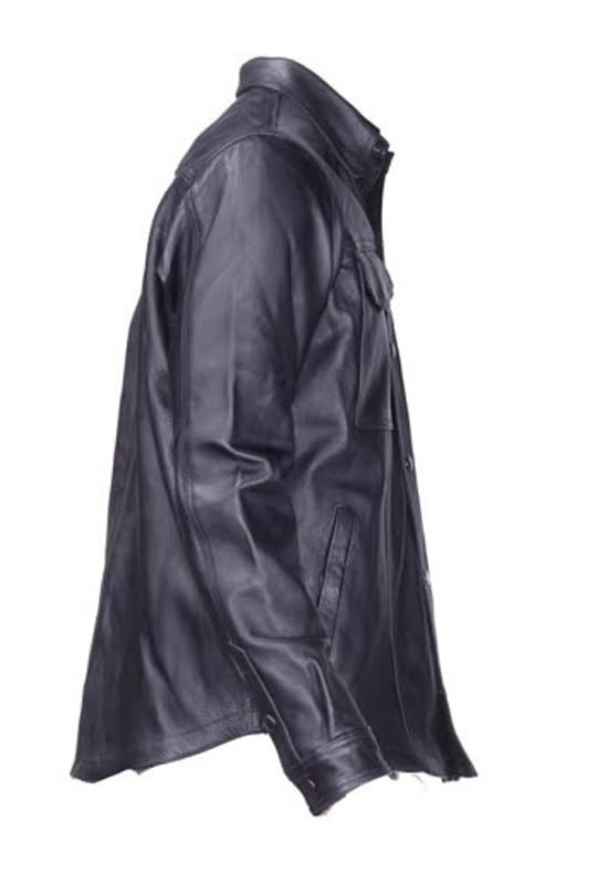 Dream Apparels Lined Leather Button shirt is a great piece of gear, awesome for motorcycle riding or a night out on the town. This Mens Lined Leather Long Sleeve shirt is made of high quality leather, features a classic slim collar, front button snap closure and button snaps at cuffs for classic styling and functionality. Multiple front pockets, 2 with snap closures, and 2 inside pockets with snap closures gives you enough room for keys, phone, wallet, gloves, hat, bandana or whatever else your adventures go. This leather collared shirt is lined for durability and added warmth and smooth polyester lining makes for amazing comfort so you can wear in numerous occasions, before your next cruise pick up our lined leather collar shirt, it has style for miles.