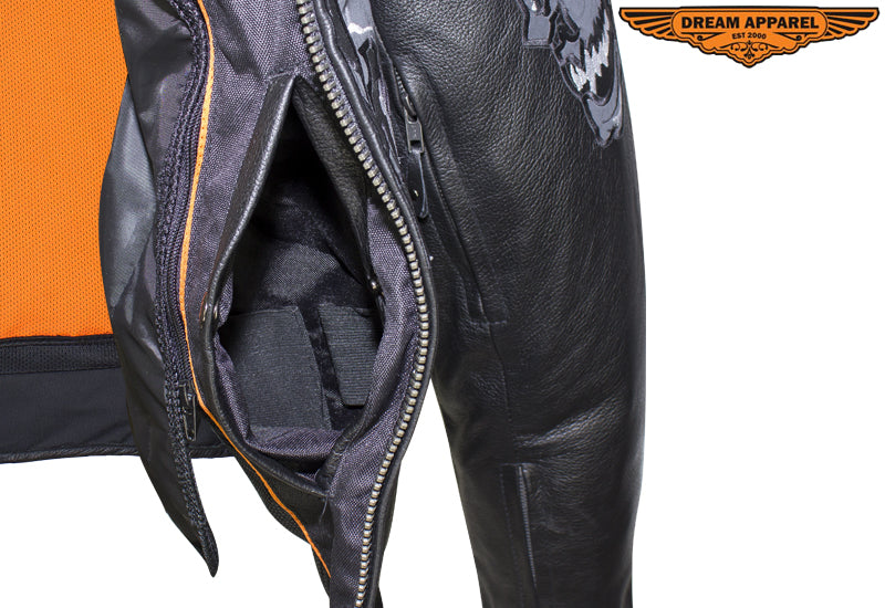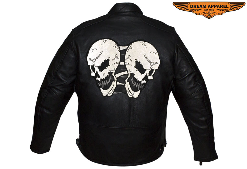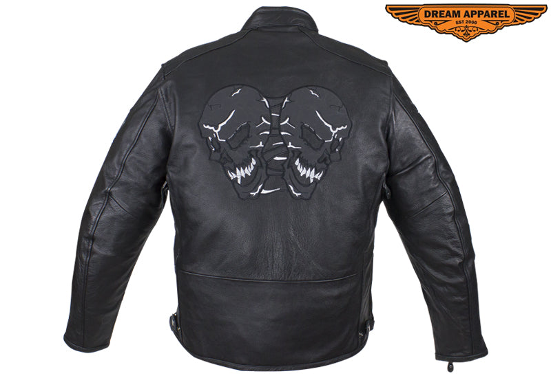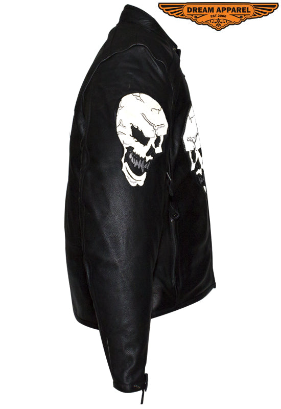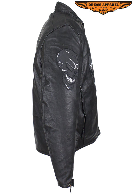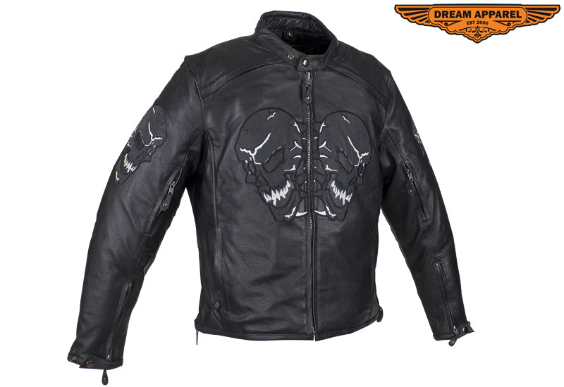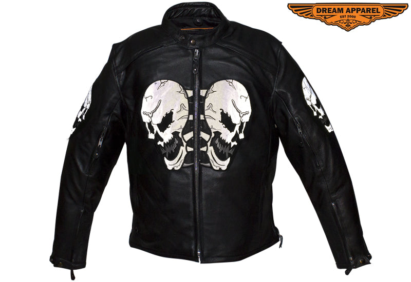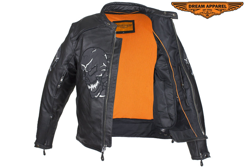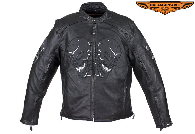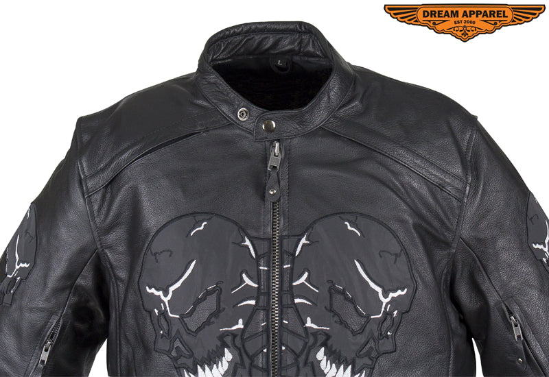 Experience the thrill while wearing our mens leather jacket which features skulls on front, back and arms. The skulls on arms are reflective for safety. The leather jacket for men includes two air vents on front, multi pockets, and racer insipred collar.