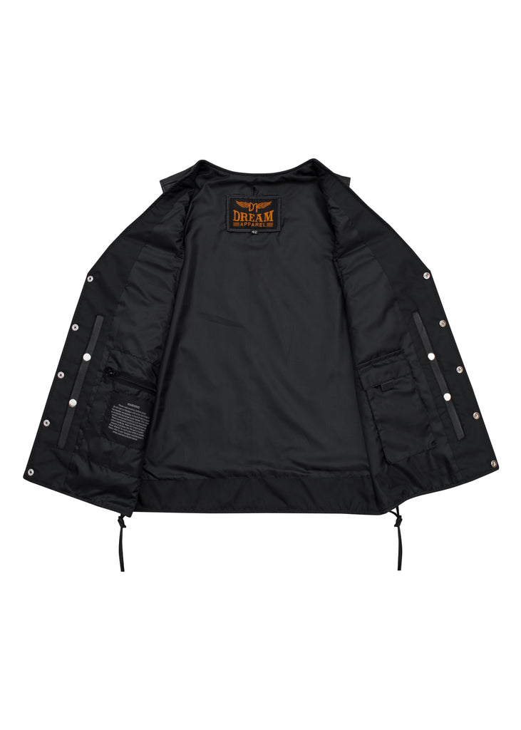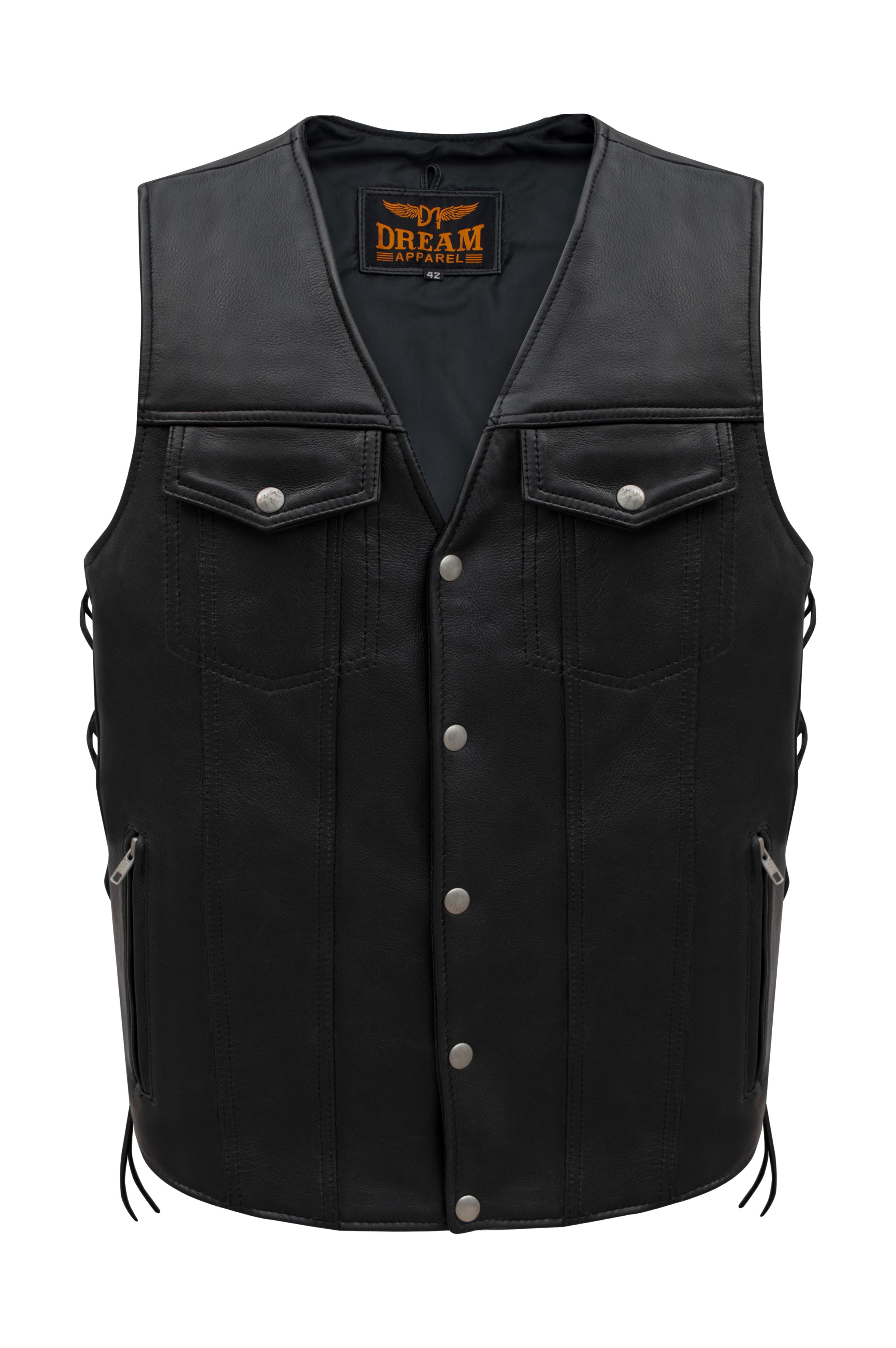 Dream Apparel Men's Black Leather Vest Buttoned Front Closure Side Laces - 42 is backordered and will ship as soon as it is back in stock.