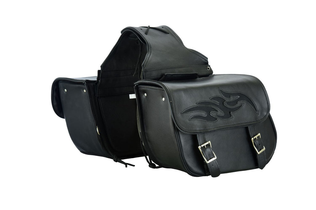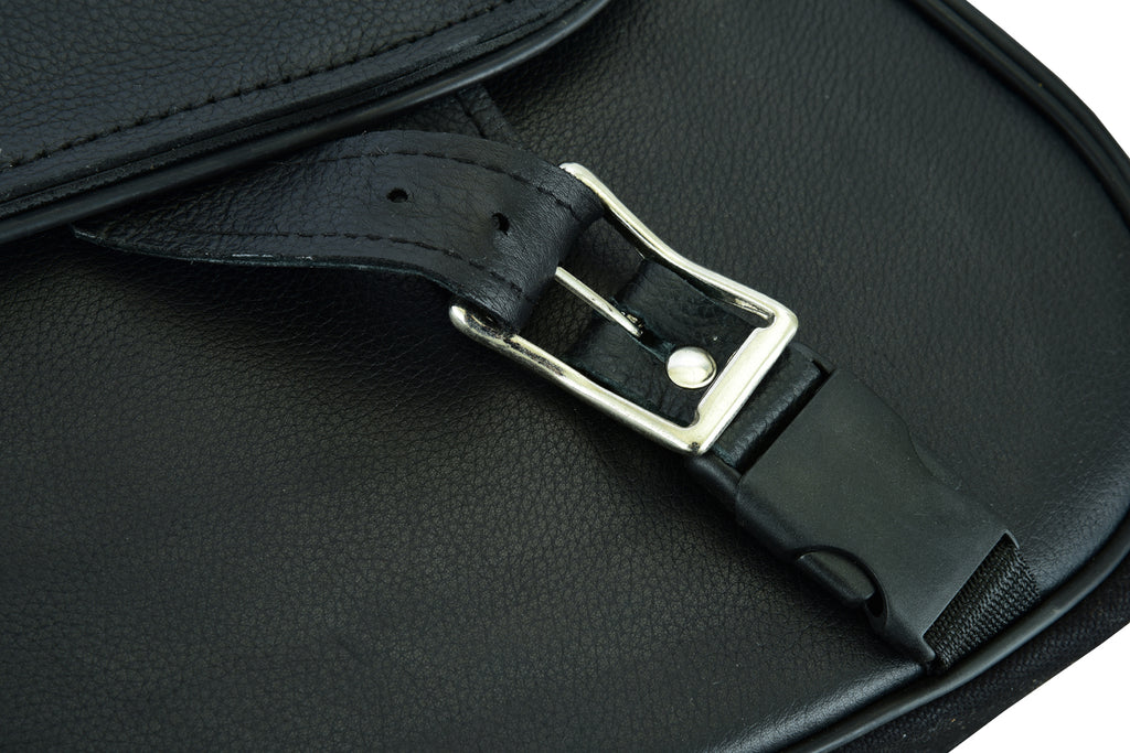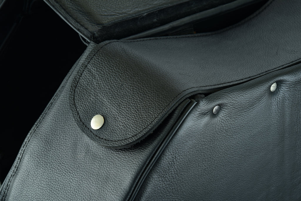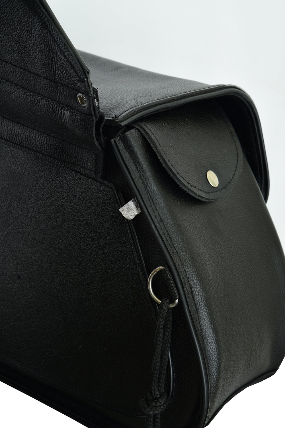 If you're looking to increase your cruising distance, then a bigger bike isn't the only thing you'll need. This 14" x 6" x 10” waterproof, naked cowhide leather is sewn around a hard shell and features elastic and adjustable strapping in each bag to secure your handguns, waterproof, guaranteed to hold its shape, and fits any motorcycle. Inside each bag is a nylon side pocket with an elastic band for smaller items. Everything is safe and secure by protective flaps over the openings with button snaps. The whole bag closes with an outer flap with heavy-duty quick release clips styled to look like vintage chrome roller buckles. The bags tie together with flaps that go over the fender and tie together by nylon laces. For added support, they zip to the flaps by adjustable covered zippers and come with four tie down laces. Each bag comes with a strong carrying handle, a protective strip underneath them to protect them from road hazards, and heat protection sheet on bottom and sides. Order yours today as these incredible saddlebags offer an amazing value and are priced to move.