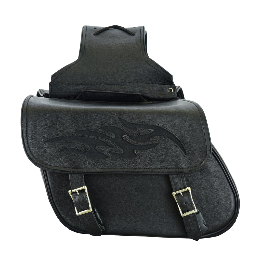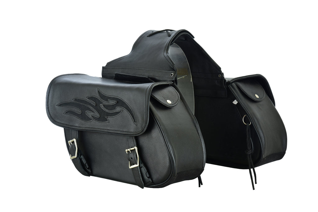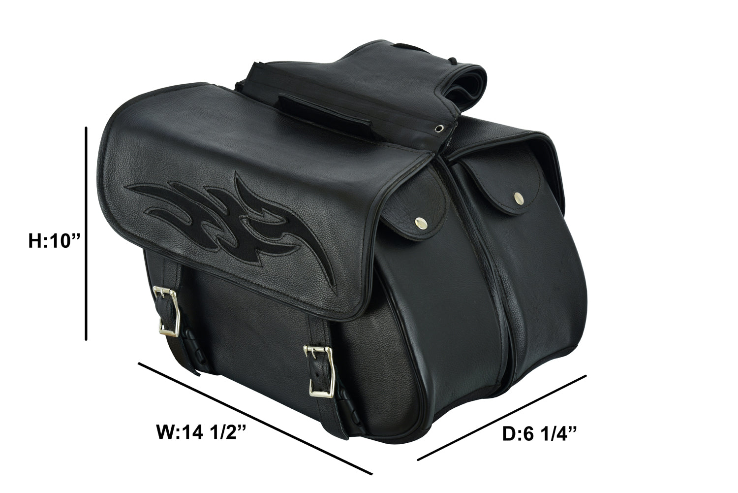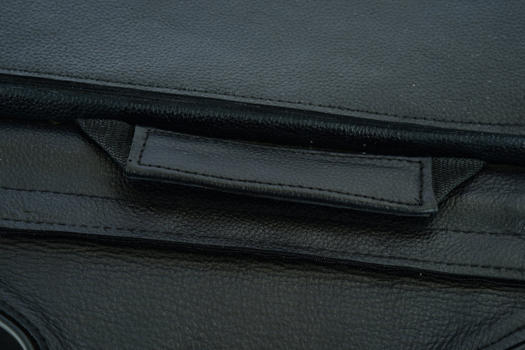 If you're looking to increase your cruising distance, then a bigger bike isn't the only thing you'll need. This 14" x 6" x 10” waterproof, naked cowhide leather is sewn around a hard shell and features elastic and adjustable strapping in each bag to secure your handguns, waterproof, guaranteed to hold its shape, and fits any motorcycle. Inside each bag is a nylon side pocket with an elastic band for smaller items. Everything is safe and secure by protective flaps over the openings with button snaps. The whole bag closes with an outer flap with heavy-duty quick release clips styled to look like vintage chrome roller buckles. The bags tie together with flaps that go over the fender and tie together by nylon laces. For added support, they zip to the flaps by adjustable covered zippers and come with four tie down laces. Each bag comes with a strong carrying handle, a protective strip underneath them to protect them from road hazards, and heat protection sheet on bottom and sides. Order yours today as these incredible saddlebags offer an amazing value and are priced to move.