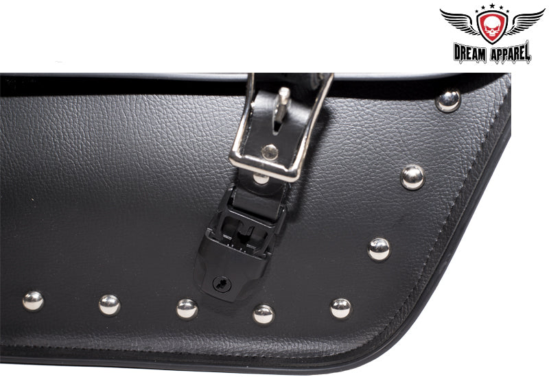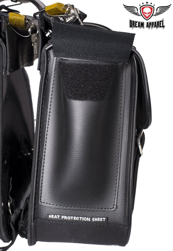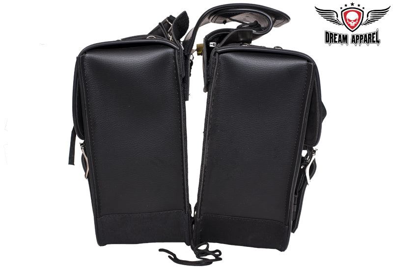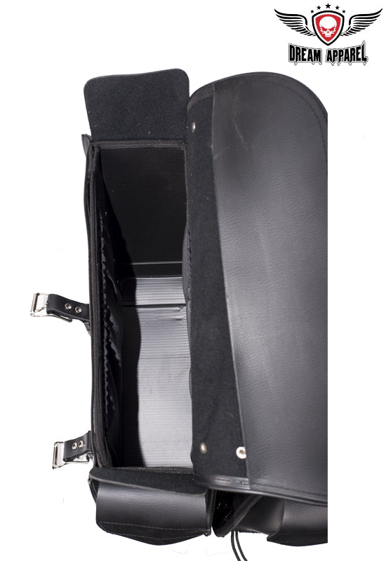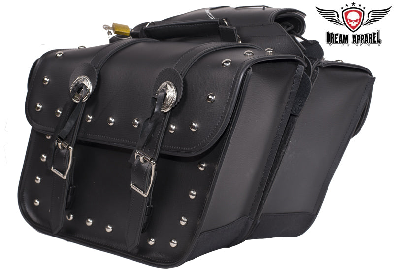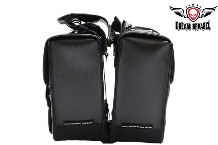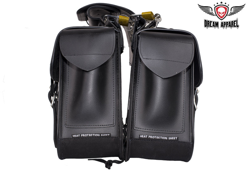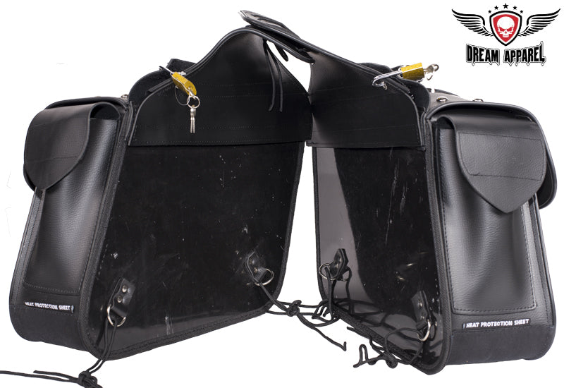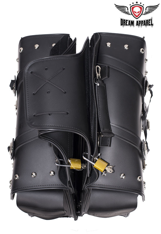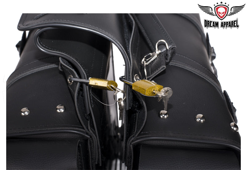 Derived from the old western days saddlebags have been a great tool for centuries, these day's saddlebags make any motorcycle ready for unknown adventures. So before you pull that iron horse out of the barn for the next exploration of windy roads make sure you're prepared with Dream Apparels PVC Throw over Saddlebags. Our universal throw over saddle bags will give your motorcycle extra storage in just a couple minutes, no hardware required. Durable strap goes over rear fender/under passenger seat and tie downs will secure to motorcycle so bags don't flap in wind. Both saddlebags can easily be removed from throw over strap by heavy duty zipper and Velcro flap and strong handles makes it easy to remove from motorcycle for cleaning, maintenance, or to carry at your destination. Inside of these bags is built with corrugated plastic sheets for durability and to hold its shape thru tough elements, each bag has 2 elastic pockets on inside for storage of smaller items such as tools, wallet, keys, gloves, bandanna, hat, glasses etc. Our throw over saddle bags will keep your items safe and secure with heavy duty closer flaps that tighten with adjustable steel buckle and quick snap buckles make for easy opening or closing of bags. With multiple badges and chrome steel studs these bags will give your motorcycle style for miles.