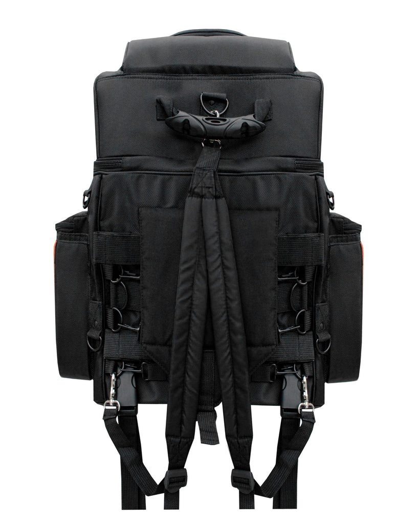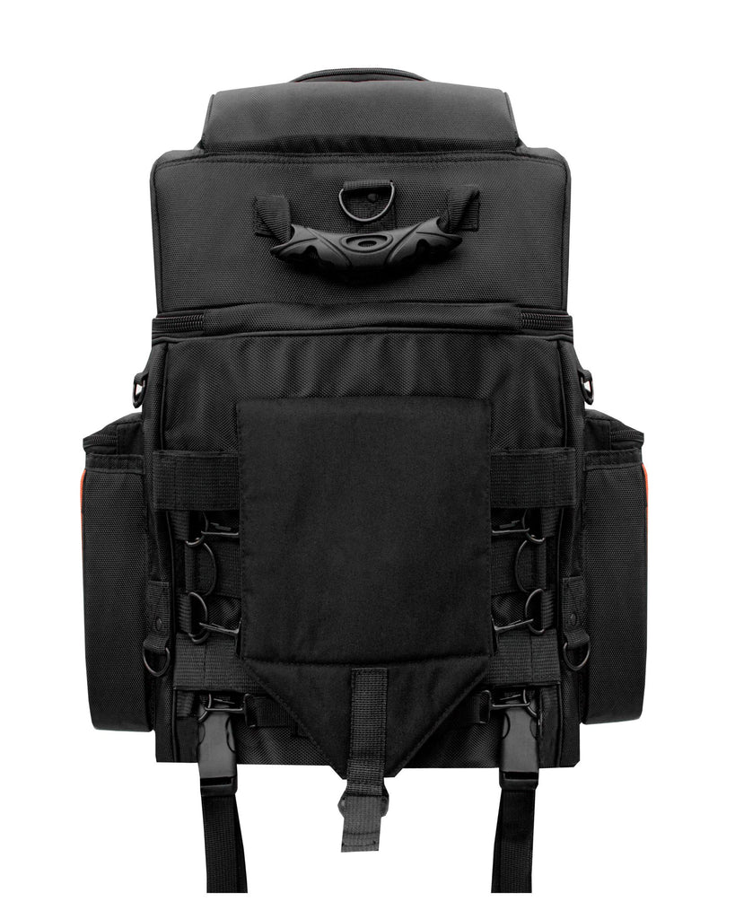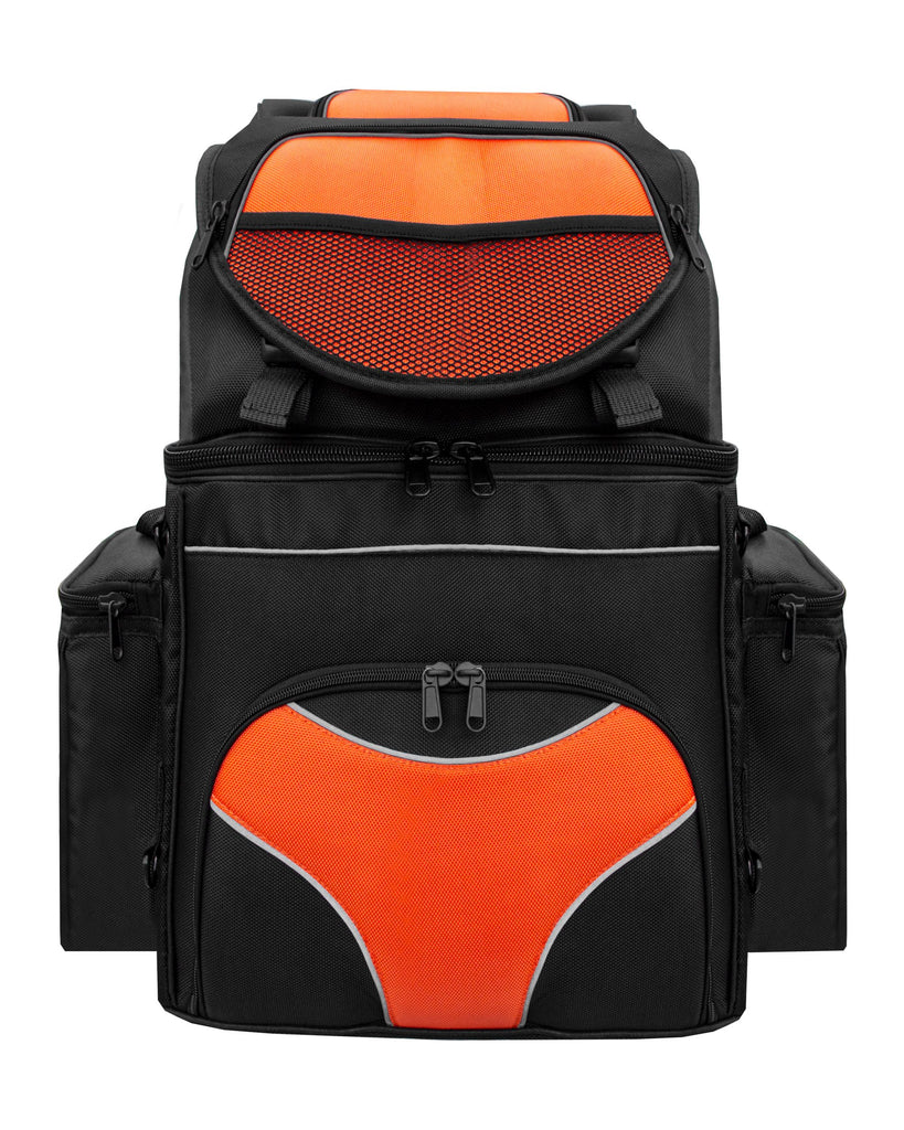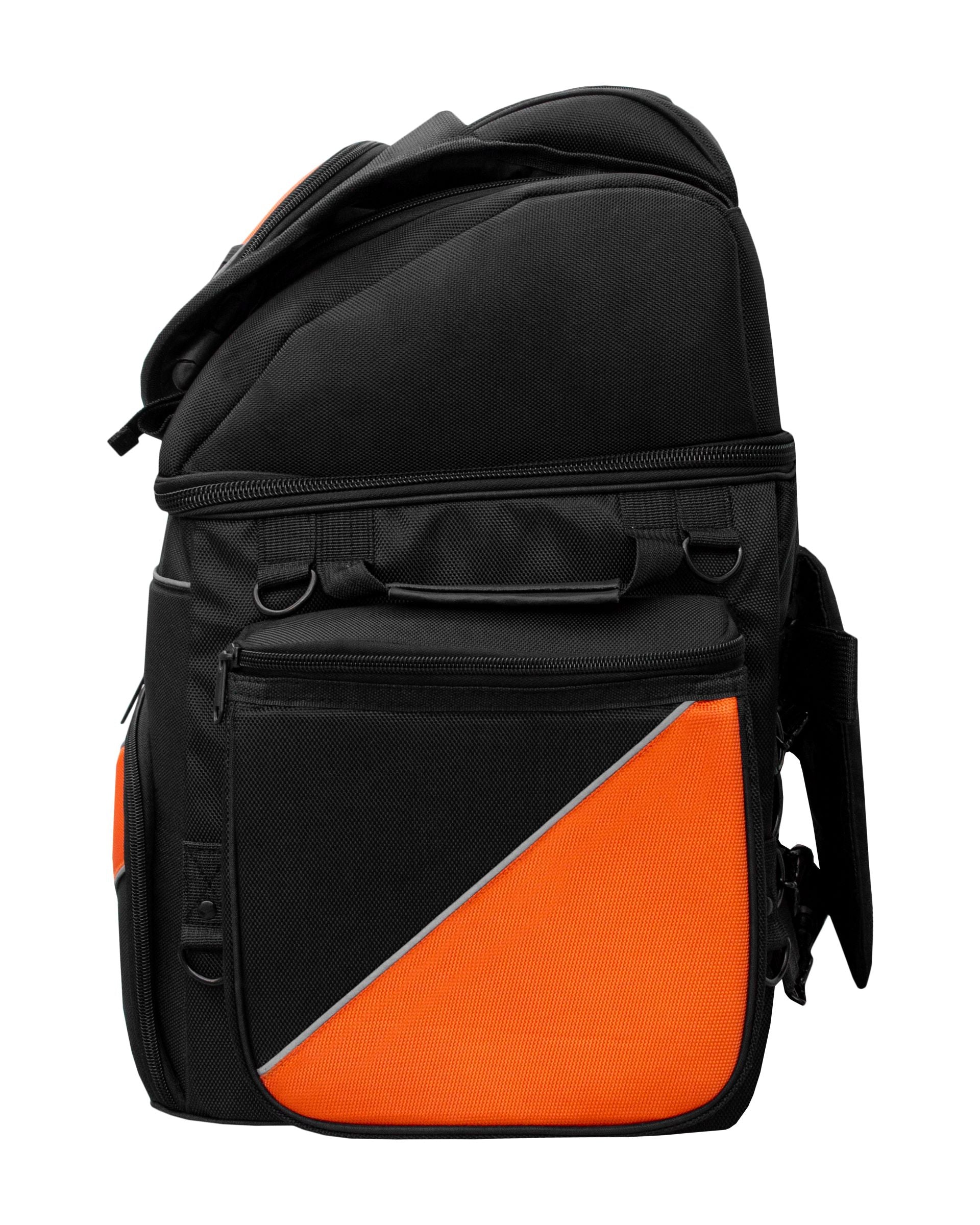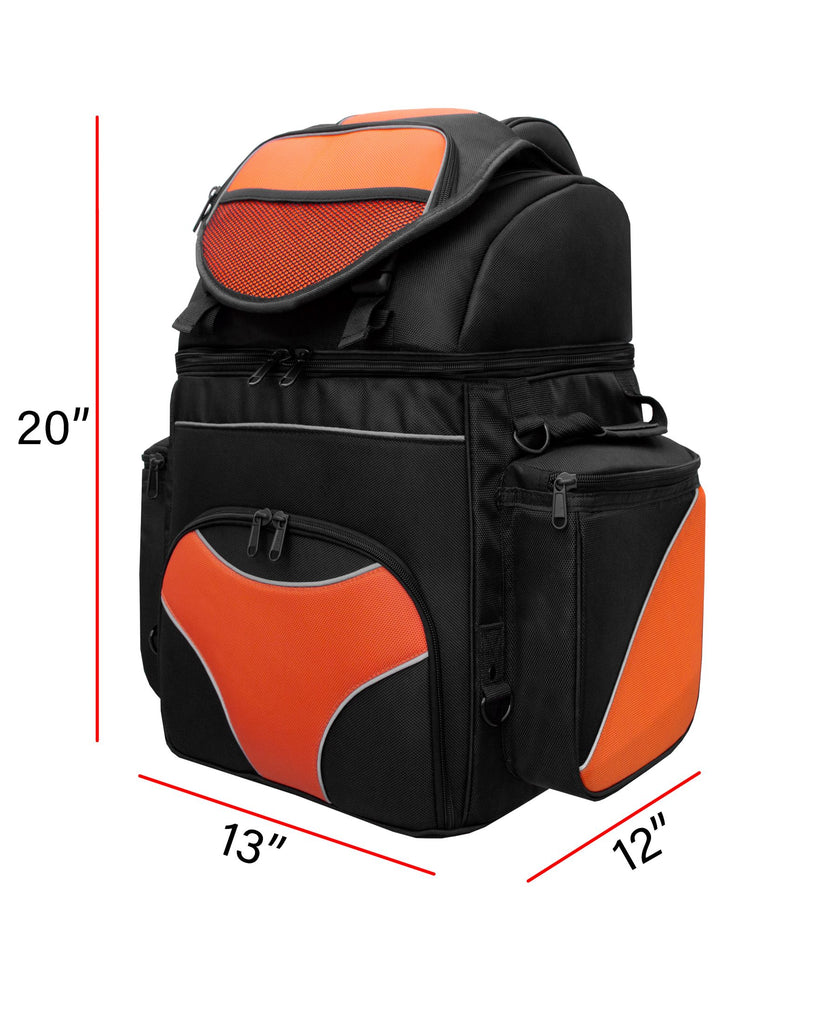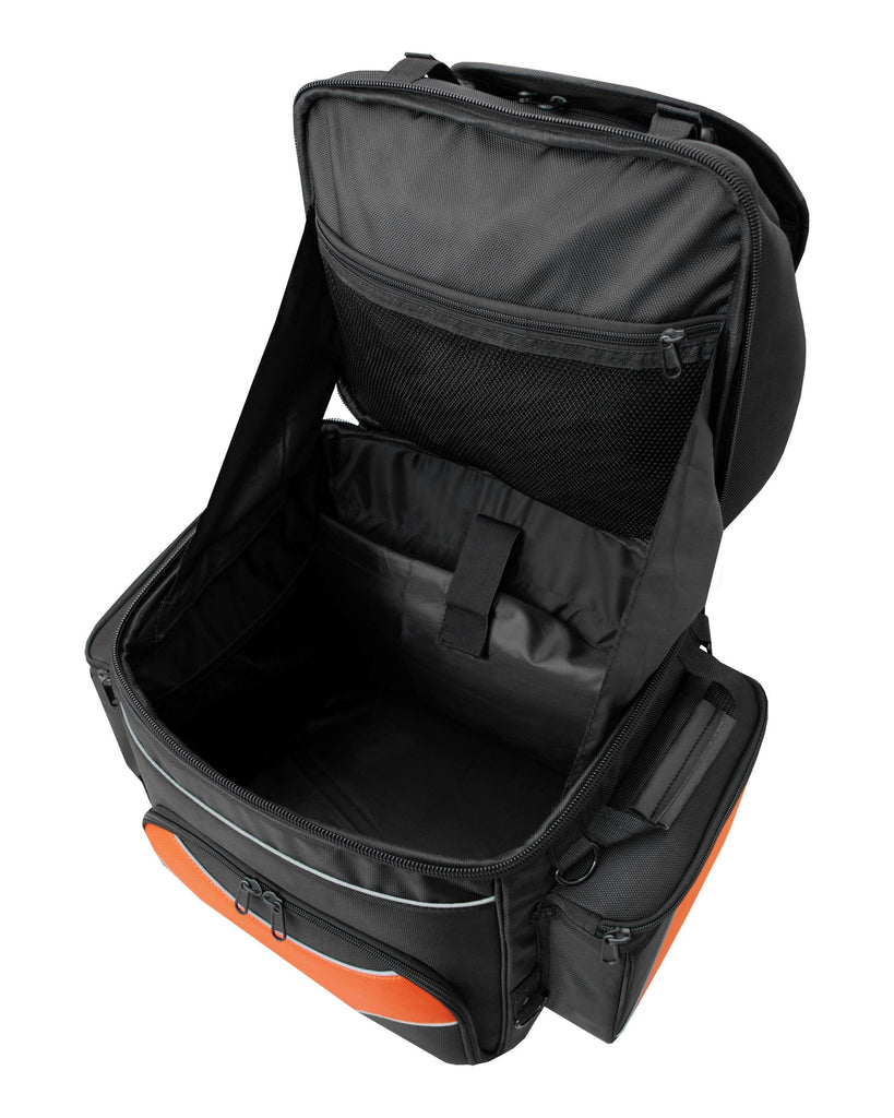Dream Apparel Black and Orange Back Seat Sissybar Bag With reflective piping is backordered and will ship as soon as it is back in stock.