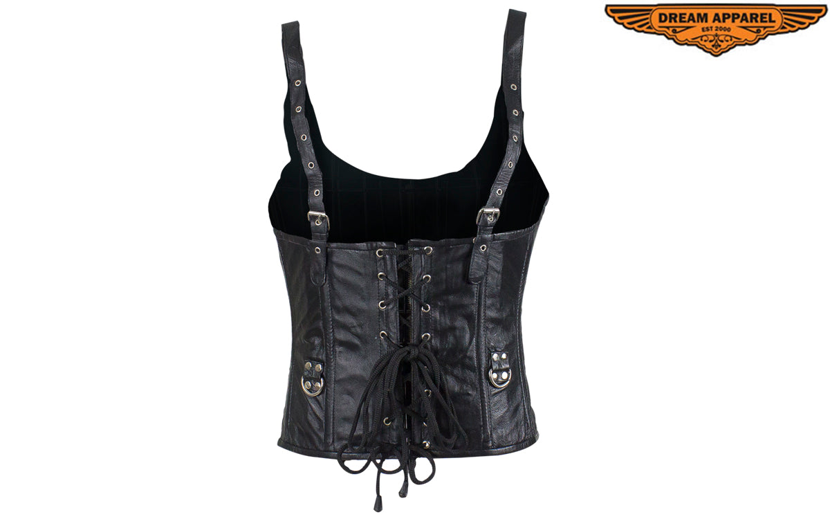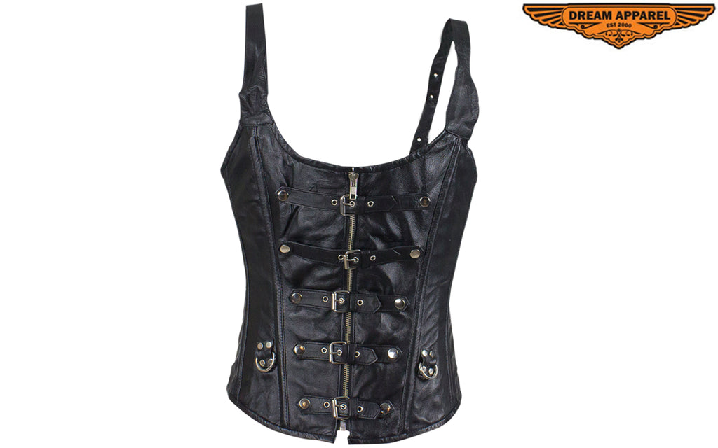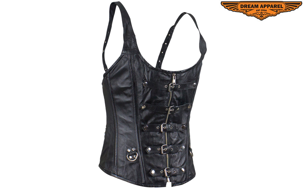 This sexy black corset is perfect for anyone that wants to spice things up. Made from genuine black lambskin leather with brushed metal buckles to adjust the shoulder straps, a zippered front closure, and five brushed metal buckles with leather straps that lay across the zipper. Matching black laces tie up the back, wrapping you in a soft textile lining that includes a soft flap that covers laces. Two polished metal d-rings hang from the waist allowing you to drape a delightful chain or other accessory from them. These trendy corsets are very popular so order yours today.