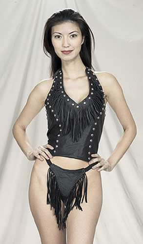 Women’s vest halter made from genuine leather sports a fringe and stud design.