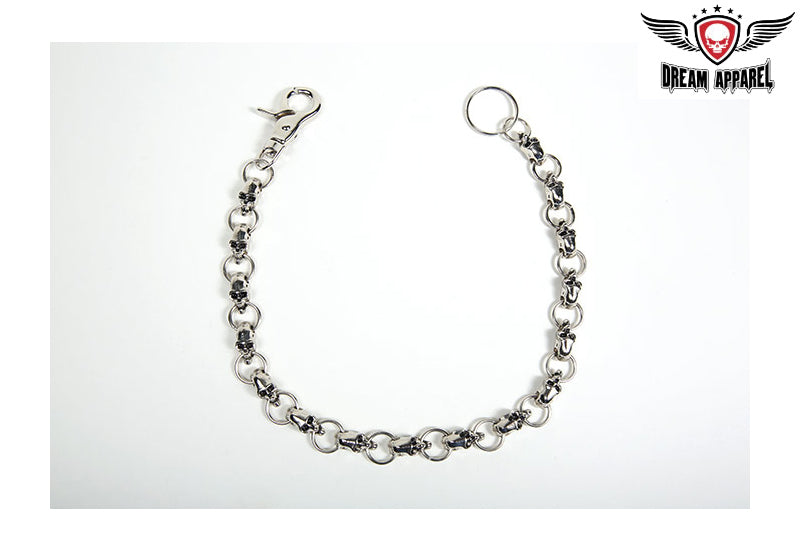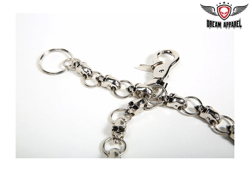 Riding a motorcycle is more than transportation to a biker, it's an attitude. Dream Apparels chrome steel skull biker chain with swivel lobster clasp will keep your items in your pockets on the next tough ride, easily attaches to wallet, keys or belt loop. This aggressive chrome steel biker chain has multiple medium skulls connected to strong steel rings that will hang on for years of rugged riding.