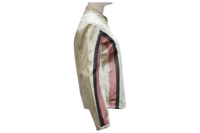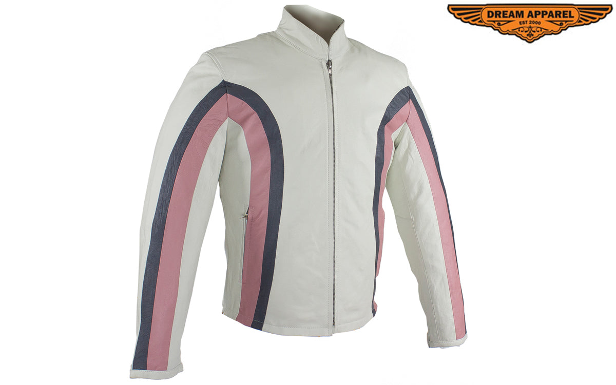 Race the wind in this top-grade, genuine leather racing jacket highlighted by black and pink stripes down each side and down the sleeves. Numerous pockets provide plenty of room for the ride and the zip-up closure, racing style collar, and zip-out lining make it comfortable any time of year.
